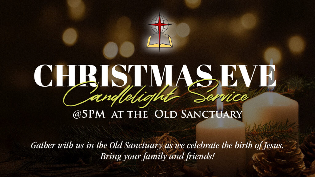 Join us for our Christmas Eve Candlelight Service at 5 pm. Remember to invite your family and friends. Service will be held in the Old Sanctuary.